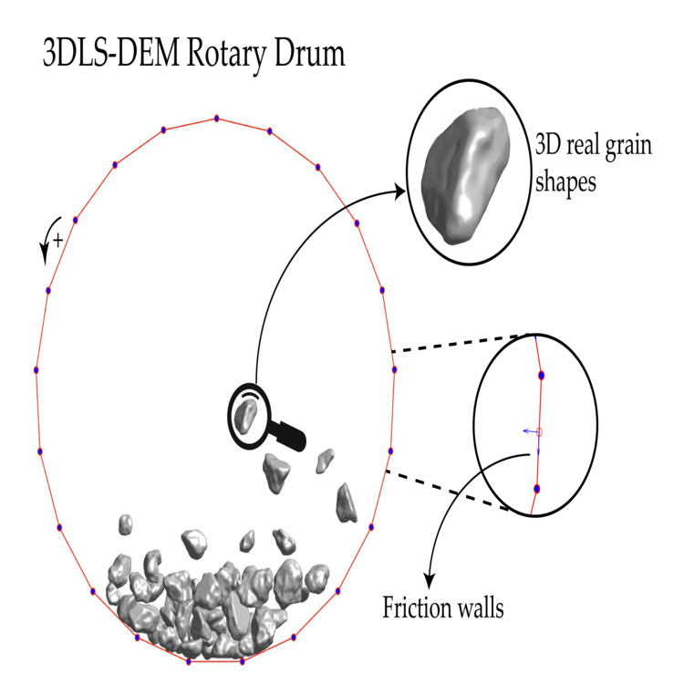 Esquema de elementos discretos capaz de segregar mezclas granulares con cohesión electrostática inducida dentro de un tambor rotativo.