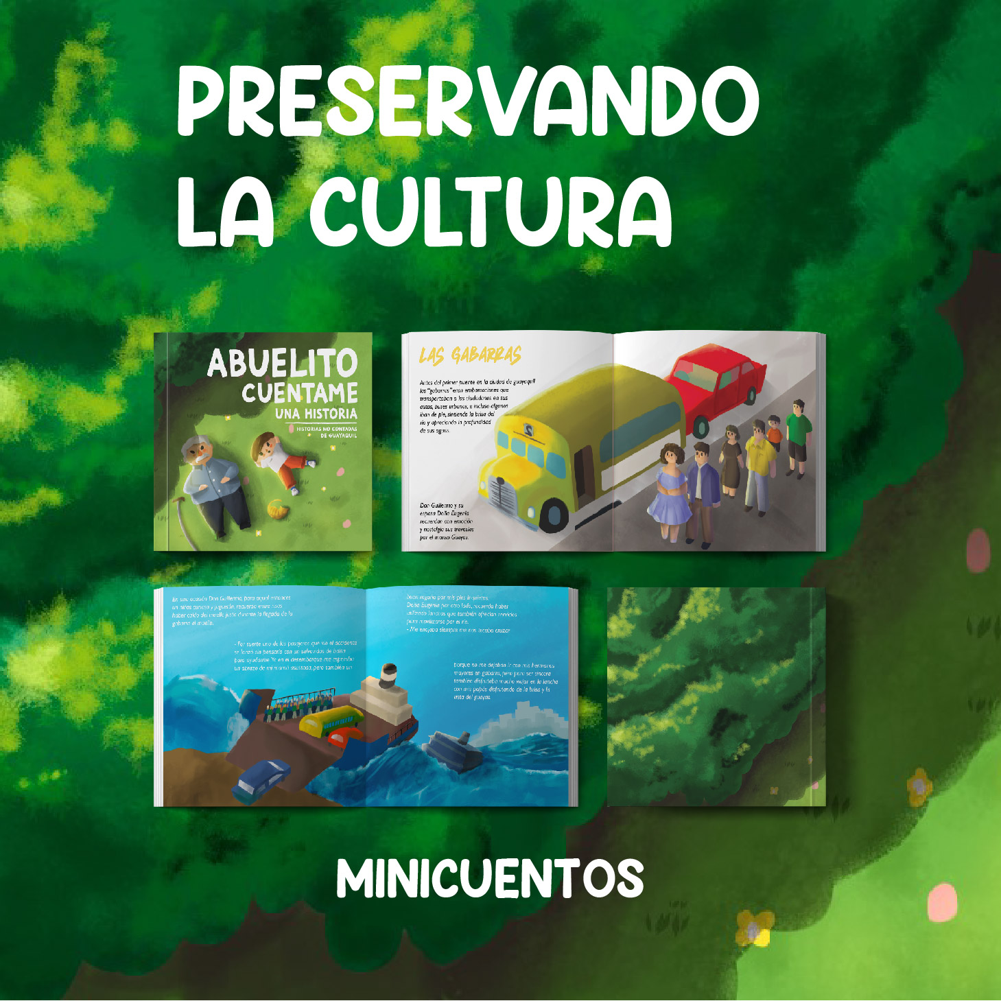Ilustración de minicuentos para la preservación de historias de personas de tercera edad de la calle Nueve de octubre en Guayaquil para niños de 6 a 10 años.